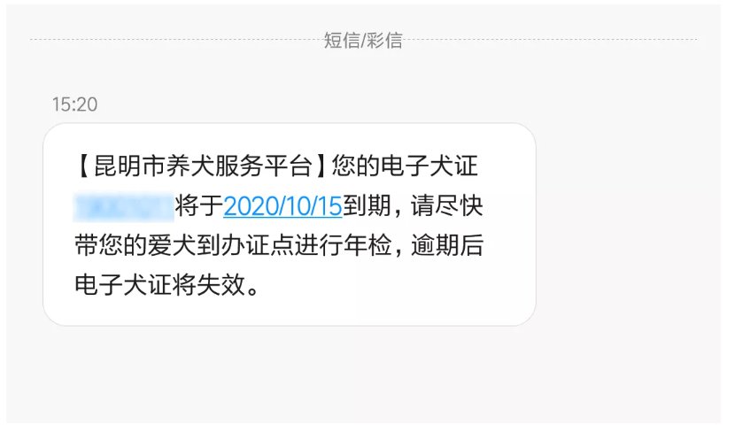 已辦理電子犬證(自登記日期起,有效期為12個月),當電子犬證有效期不足1個月時,平臺會發送短信提示犬主。