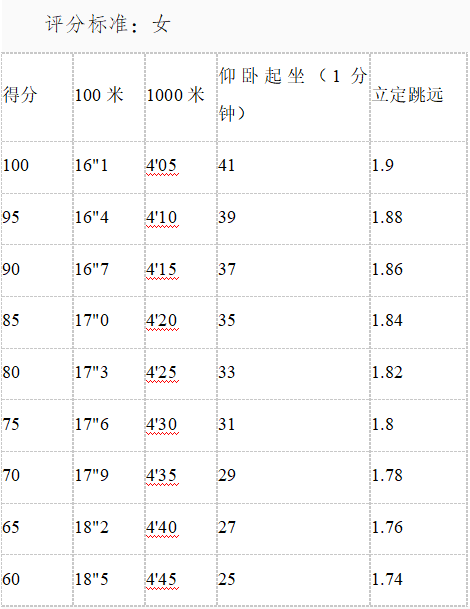 體能測試成績(女)=(100米+1000米+仰臥起坐+立定跳遠)/4