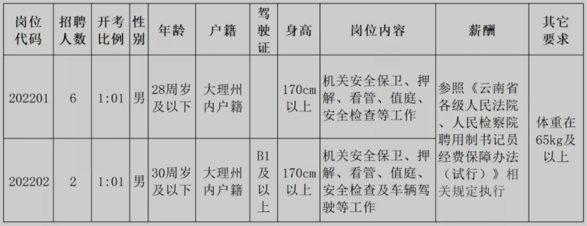 大理州中級人民法院2022年公開定向招聘合同制法警招聘崗位、人數、及薪酬