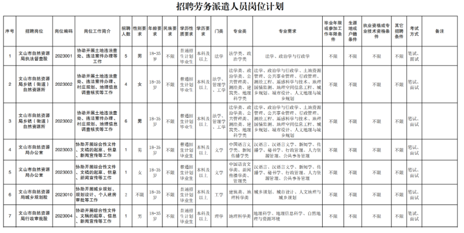 公開招聘人員20名。具體崗位、人數、資格條件等詳見《文山州財信人力資源有限公司公開招聘勞務派遣人員崗位計劃》(以下簡稱《崗位計劃》),報考人員可通過“文山人才網”微信公眾號、文山人才網、“文山市城鄉投”公眾號查看招聘信息。