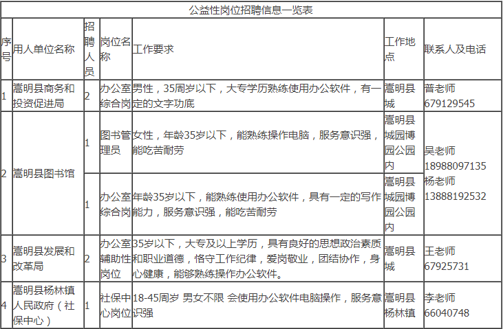 招聘具體事宜請咨詢用人單位。符合公益性崗位上崗條件的個人也可以到嵩明縣勞動就業服務局綜合科申請公益性崗位求職登記,詳詢陳老師:0871-67917444。