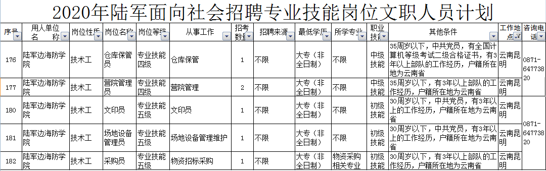 根據(jù)《中國人民解放軍文職人員條例》及有關政策規(guī)定,陸軍2020年將面向社會招聘912名專業(yè)技能崗位文職人員。現(xiàn)就有關事項公告如下: