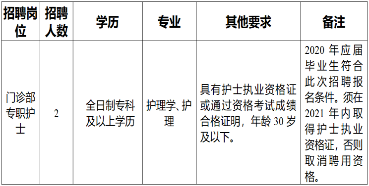 (六) 2020年應屆畢業生符合此次招聘報名條件,如被聘用,須在2021年內取得護士執業資格證,否則取消聘用資格。